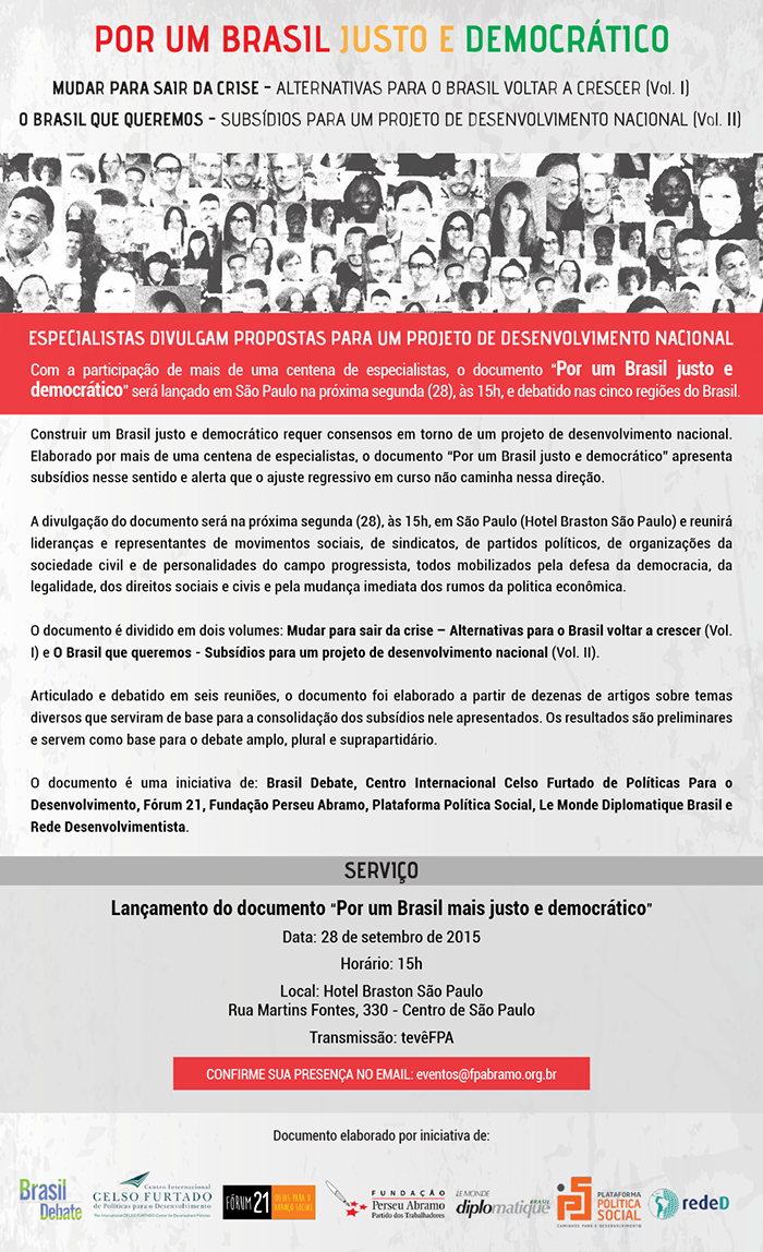 Construir um Brasil justo e democrático requer consensos em torno de um projeto de desenvolvimento nacional. Elaborado por mais de uma centena de especialistas, o documento Por um Brasil justo e democrático apresenta subsídios nesse sentido e alerta que o ajuste regressivo em curso não caminha nessa direção.