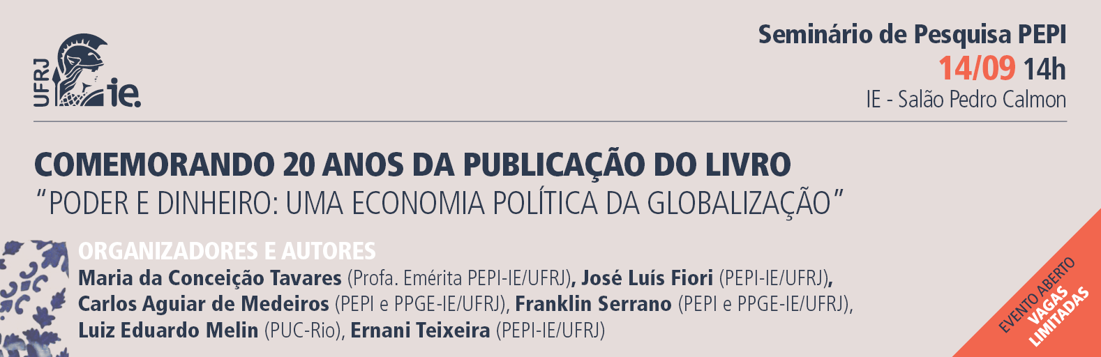 O Programa de Pós-Graduação em Economia Política Internacional, do Instituto de Economia da UFRJ, convida a todos, para o Seminário do PEPI-IE/UFRJ comemorando 20 anos da publicação do livro "Poder e dinheiro: uma economia política da globalização", no dia 14 de setembro de 2017, às 14 horas, no Salão Pedro Calmon (UFRJ Praia Vermelha).