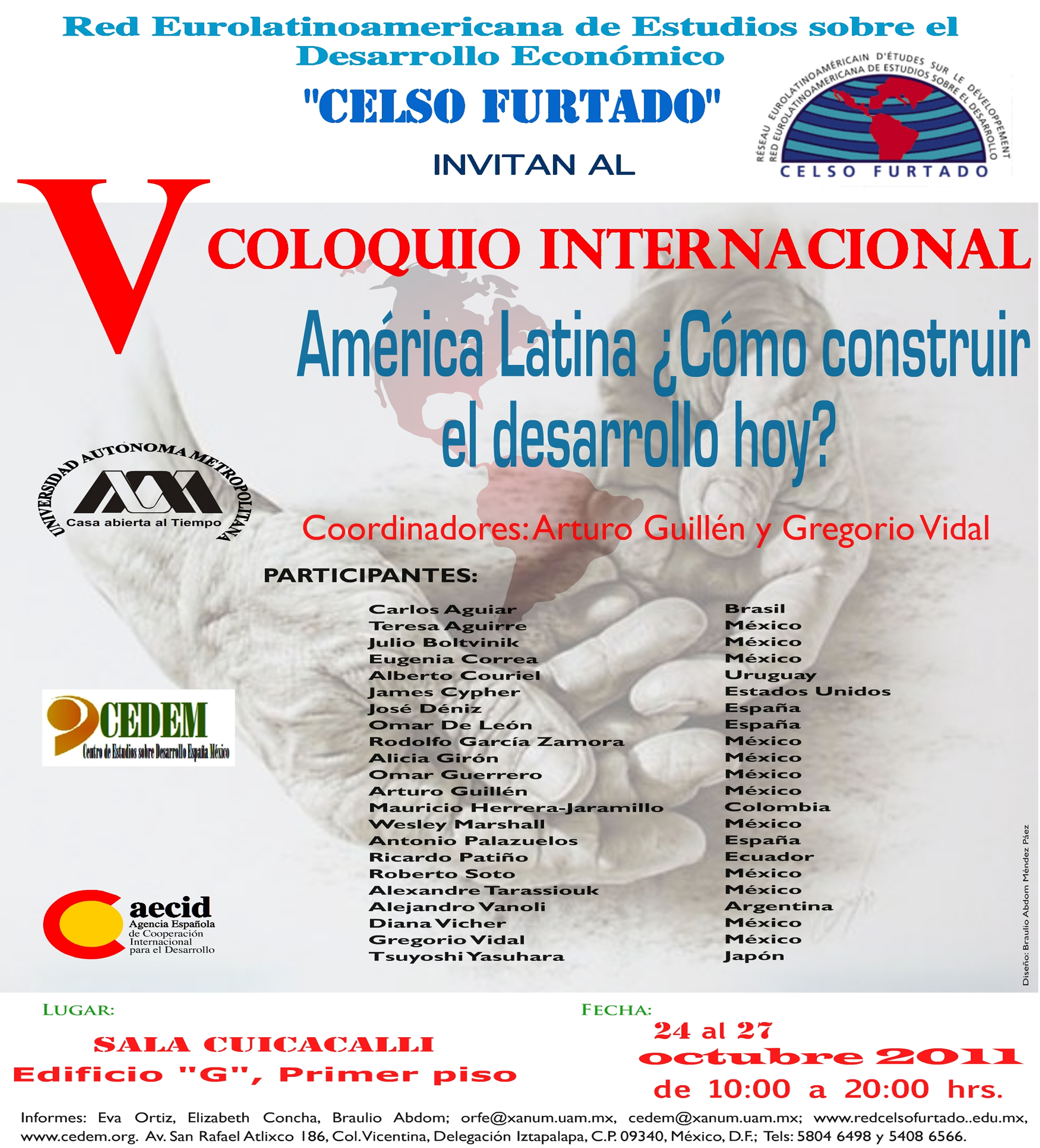 Todos temas que deben ser abordados en el V Coloquio de la Red Furtado. El impulso al desarrollo exige actuaciones apoyadas en conocimientos no específicamente económicos, inspirados en otras disciplinas. Las instituciones sociales, el nivel sanitario, la administración de justicia, los procesos educativos y otros aspectos semejantes, influyen con más o menos intensidad. Las tendencias actuales de la educación en nuestros países occidentales, se desvían por rumbos perjudiciales y contradictorios al perfeccionamiento humano, más orientadas a conseguir productividad y competitividad que a mejorar la libertad de pensamiento y la convivencia pacífica. Un elemento notable que requiere ser explorado y examinado es la vinculación entre el mundo académico (La teoría económica del mainstream) y el complejo financiero-público-privado (entidades financieras estatales nacionales e internacionales y mundo empresarial transnacional); en suma qué se enseña y practica y por qué, y cuales son las escuelas o enfoques alternativos. En fin, convocamos igualmente a discutir los medios, que son económicos, pero a la vez políticos, para construir relaciones económicas internacionales que no estén fundadas en la asimetría y la dominación. Sin duda, es un tema destacado para analizar la ruta de MERCOSUR y de la Unión Sudamericana de Naciones (UNASUR), así como de otros proyectos de integración o cooperación Sur-Sur. ¿Cómo influye en América Latina la nueva situación que se esta creando en Asia, en particular el papel de China? En esta materia se presenta una interrogante sustantiva: ¿Es posible avanzar hacia el desarrollo sin construir relaciones económicas con otros países fundadas en la asimetría? Y otras preguntas más: ¿En las condiciones actuales será posible recuperar el crecimiento sostenido y con ampliación de las capacidades de producción, sin una transformación profunda de los mercados internacionales de capital? ¿Qué implica la vuelta a esquemas primarioexportadores frente a la opción de ampliar los mercados internos y propiciar la diversificación exportadora? Estamos convencidos que la construcción del desarrollo y el fortalecimiento y ampliación de la democracia son las tareas sustantivas de nuestro tiempo para una inmensa mayoría de los países y pueblos del planeta. También, que ambos son el resultado de un proyecto que conjuntos determinados de grupos sociales llevan adelante. No son resultado de ningún automatismo económico, menos de la recuperación de la disciplina de mercado. Discutir con base en estas ideas es la propuesta que les comunicamos, el espíritu que debe guiar nuestros debates en ocasión del V Coloquio de la Red Celso Furtado a realizar en la Ciudad de México, en las instalaciones de la Universidad Autónoma Metropolitana, Unidad Iztapalapa, entre el 25 y el 27 de octubre de 2011.