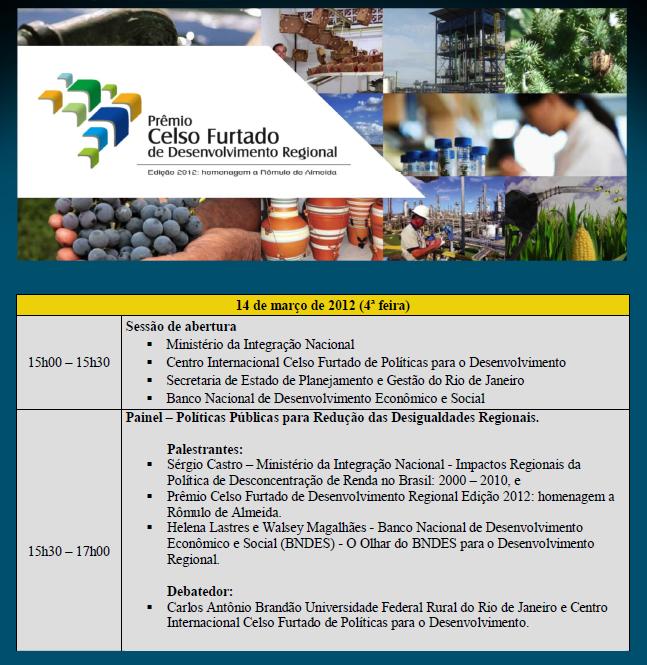 O Ministério da Integração Nacional, o Centro Internacional Celso Furtado de Políticas para o Desenvolvimento, o Banco Nacional de Desenvolvimento Econômico e Social - BNDES e a Secretaria de Estado de Planejamento e Gestão do Rio de Janeiro realizaram o painel Políticas Públicas para Redução das Desigualdades Regionais e apresentaram, na ocasião, o Prêmio Celso Furtado de Desenvolvimento Regional edição 2012: homenagem a Rômulo de Almeida.